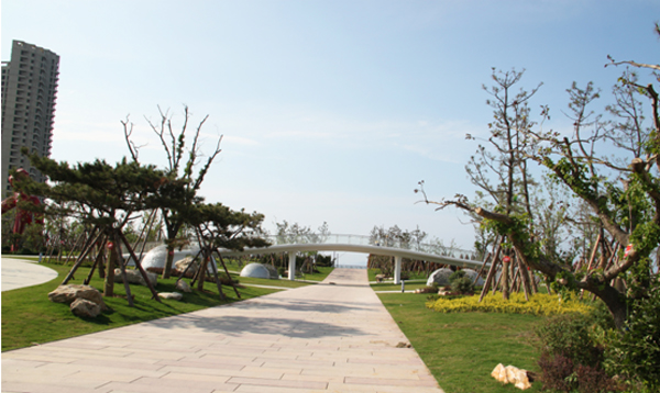 人行路桥高6米,长60米,与园路相互连接,立于桥上,可观四季美景,览海滩盛宴,是广场中观景的好去处。
