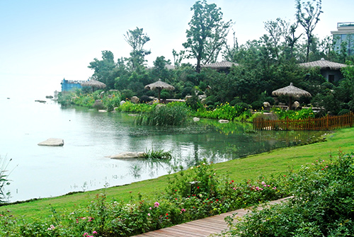 该项目将“以人为本,尊重自然”贯穿于设计到施工的各个环节,为了最大限度地保护太湖水域环境,各个施工环节中,因地制宜,因材施用,在驳岸处理中,通过草坪入水、水生植物种植、景石运用等方法,在充分保护原有湖岸的基础上,加强对湖水水质的净化,营造出生态、自然的湖岸景观,成为项目中的一景。此外,种植的植物,大量选用当地乡土树种,既营造出浓郁的景观特色,又有利于提高植物的成活率,减少后期的养护费用,有效节约了工程成本。