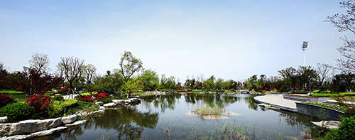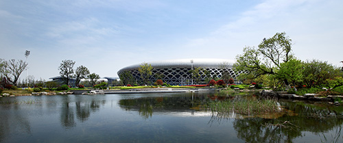 据夏修智介绍,奥体公园是工程的主要景观节点,位于奥体中心西北侧,面积约5万平方米,是一座集娱乐、运动为一体的特色滨水运动公园,也是整个奥体中心的“绿肺”。一条蜿蜒的河流将公园划分为东部运动区和西部休闲公园区。运动区紧挨训练中心,东侧便是足球场、篮球场和排球场,运动后就能感受到融入大自然的清新;休闲公园区包括入口广场、树阵广场、以及河水汇聚而成的小人工湖,湖边芦苇迎风摆动,湖水清澈见底,鹅卵石铺就的湖底清晰可见。整个奥体公园以中国古典园林为主、回归自然的组团式造景手法,强调休闲、幽静、生态自然。从西入口广场的草坡,逐渐过渡到观赏性强的观花、观叶园林树种,配合灌木、草木、地被形成人为景观,从西到东植物次第减少,层次不断变化,形成了从自然生态状绿化到人工几何状绿化的逐渐过渡,让自然的活力与体育精神融为一体。