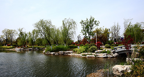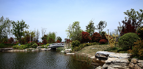 其中,人工湖面积7000平方米,小而精致,可谓是整个公园的“点睛之笔”。由亲水平台区,源头区,中心湖面区,邻水生态区,桥梁区构成。湖面区域贯穿整个工程,没有自然条件的衬托,完全由人工园林造景手法完成,在邻水景观带种植睡莲、荷花、再力花、千屈菜、鸢尾、芦苇等水生植物,营造生态岸线,同时选择其他亲水植物,如美人蕉、碧桃、杨柳、水杉作为过渡和背景,虚实结合,营造出多方位的景观效果。湖面虽小,但结构完整,假山叠水,拱桥,原石临水桥,湖边卵石生态群落一应俱全。其中,景石主要使用了安徽的灵璧景石,约7000吨,堆叠出水源、暗桥、亲水沿岸等景观。