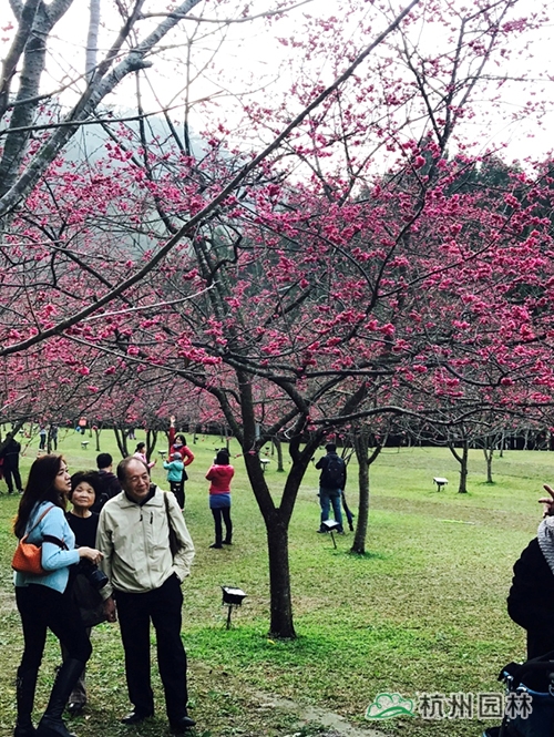 南投九族文化村、嘉义阿里山、台北阳明山公园都是台湾有名的樱花观赏景区。这些景区内常见的观赏樱花品种主要有八重樱系列品种、染井吉野、琉球寒绯樱等;景区内常见的樱花园林应用形式有:片植于草坪或停车场上,列植于道路两边,孤植作为独赏树。