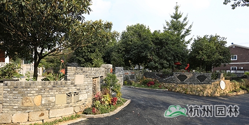 钱三组共有31户人家,以前,这里家家都是高墙大院,虽然每家的小楼都盖得很有特色,但却被高高的院墙挡住了院内的风光,而且整体绿化景观单一,缺乏本土特色和文化气息。如今,高高的围墙被拆除,改为以旧青砖为主,搭配铝合金栏杆,以老石板、旧瓦片、老石磨、老石鼓等作为点缀,怀旧物件与现代元素有机结合,营造出全新的集古朴与时尚于一体的敞开式景墙。在景墙内侧种植桂花、意大利络石等绿篱,墙外地面种植麦冬等常绿草本植物;在每家庭院入口两侧和一些节点处设置小花境,种植各类常绿、色叶、草花等植物,营造出风格多样的花境景观,在软化景墙生硬感的同时,景观更加丰富多变。