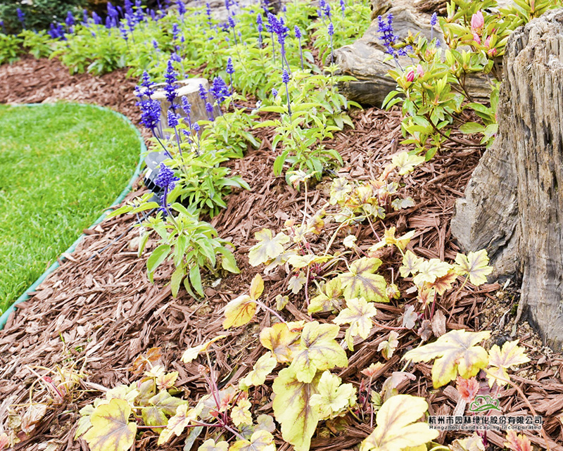 除了土壤改良,裸露地面还铺了一层棕色覆盖物,这是一种用树皮深加工成的新型产品,里面加入了有利于植物生长的营养成分。不但具有美观的作用,而且可以有效防止水分蒸发和水土流失,冬天则具有保温作用,防止植物根系冻伤。