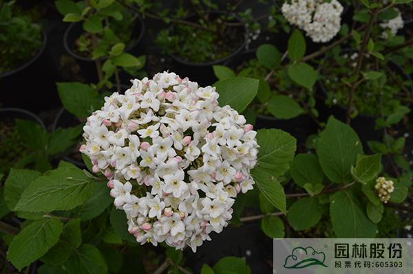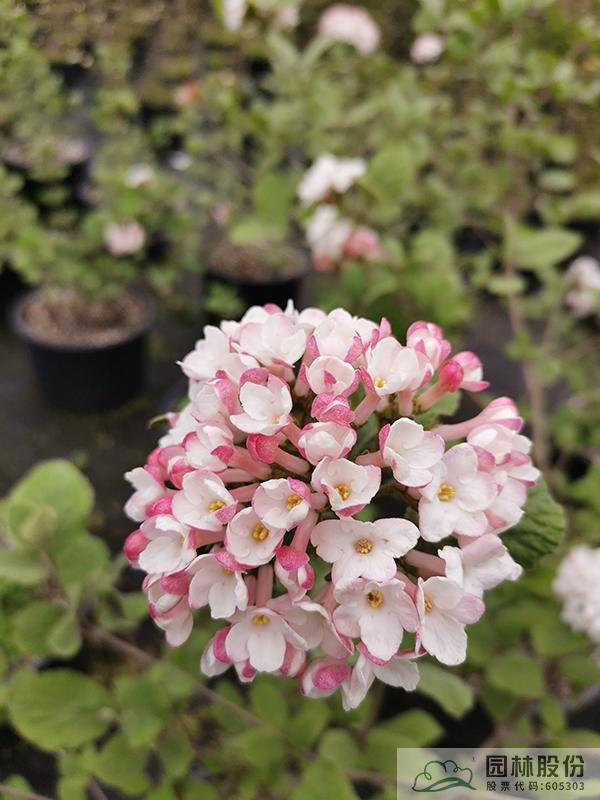 忍冬科荚蒾属,半常绿或常绿灌木,株高2-3 m,为红蕾荚蒾和烟管荚蒾的杂交种。叶色深绿,秋季转红,颜色程度因所处地区而异。该种继承了红蕾荚蒾粉花的优良基因,花序未开放时呈现靓丽的粉色,开放后白色,且具有较浓郁的花香。花径一般4.5-10 cm,花期3-4月。植株具有良好的顶端优势,枝条年生长量大,但分枝能力稍弱。几乎无病虫害。适应性强,生长速度快,耐干旱且耐寒,适合自然风格的工程应用或庭院观赏。